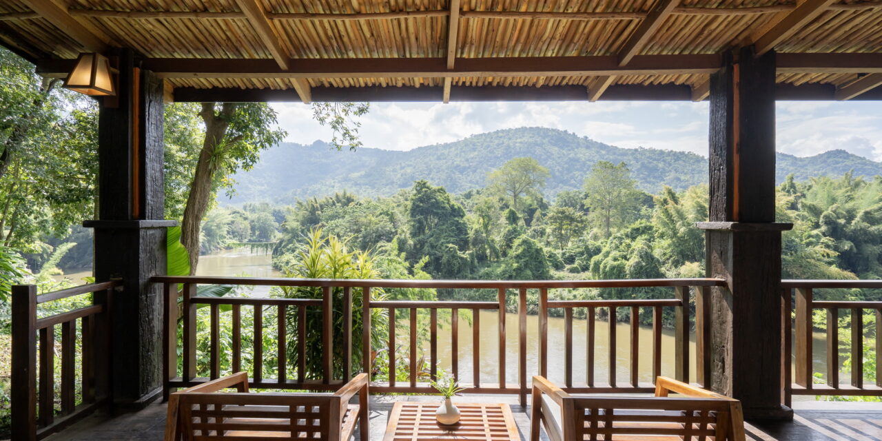 Room facing the River Kwai, features a terrace and natural hot spring bath with a splendid view.